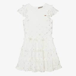 Girls elegant ivory lace dress by Le Chic, with a soft jersey base layer. It has adjustable shoulder straps and off-the-shoulder sleeves. The front is trimmed with a gold metal logo tab and the sleeves and hem have ruffled trims.