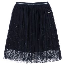 Off white pleated tulle skirt for girls from Le Chic. It has an under layer of pretty lace, with silver thread and faux pearl detail. Lined in comfortable jersey, there is an elasticated beige waistband with a silver stripe, and the brand's silver logo charm and bow is on the front.