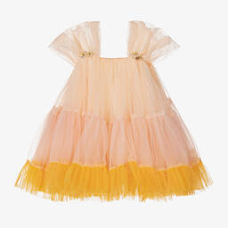 This girls pink and purple tulle dress by Le Mu is exclusive to Childrensalon. Crafted from lightweight tulle in a dramatic trapeze silhouette, the skirt is tiered in complementary purple and pastel green colours. The sheer short sleeves are embellished with faux pearls and crystals on the front, adding a touch of sparkle. Fully lined in breathable cotton, it features a smooth satin underlayer and a concealed zip fastening for a neat finish. Limited quantities available, don’t miss out.