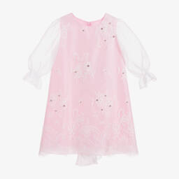 Girls elegant black and white dress by luxury brand Lesy. Fully lined in soft cotton, the sheer chiffon bodice has pretty chiffon and lace ruffles around the neck and on the front. The sparkly black skirt is pleated in stretchy tulle, with a lightweight cotton lining and frills of tulle for a fuller shape. The waistband has a bow with square crystal buckle detailing.