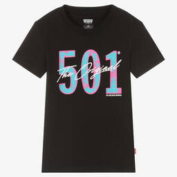 White T-shirt for boys by Levi's, made in soft cotton blend jersey. The front is printed with a bold neon pink and green 501 logo, inspired by the brand's original denim style. The signature Red Tab can be found on the side seam for added logo appeal.
