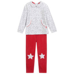 Red and blue top and trousers set for little girls by Levi's. Made in soft and stretchy cotton jersey, the grey marl top has red sleeves and a red, pink, blue and white heart with logo print on the front. The navy blue jeggings have a slight stretch, two back pockets, a logo patch and an elasticated waist for a comfortable fit.
