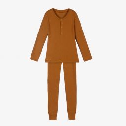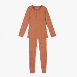 Boys blue pyjamas by Liewood, made in ribbed organic cotton jersey. The top has front popper fastenings and the designer's name in tone-on-tone embroidery on the hem. The snug-fitting trousers have a comfortable elasticated waistband.