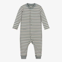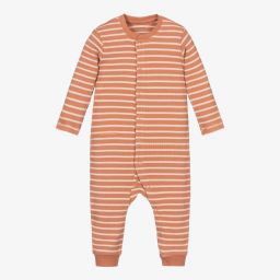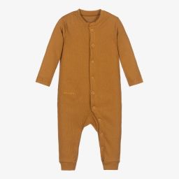 Caramel yellow and ivory striped romper for baby boys and girls by Liewood. Soft and comfortable, it is made in ribbed organic cotton jersey with an embroidered logo on the front.