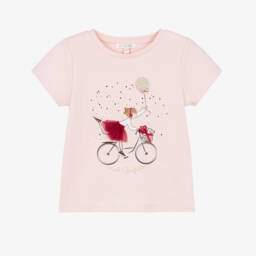 Pale pink T-shirt for girls by Lili Gaufrette, made in soft cotton jersey. This casual tee features a lovely gold and red graphic of a girl on a bicycle. The tutu skirt is embellished with a pretty tulle bow and there is a delicate gold logo printed below.