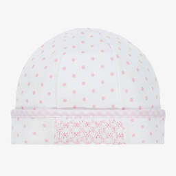 Baby blue polka dot hat by Magnolia Baby is crafted from super soft Pima cotton. This adorable hat features a double layer of jersey for added comfort, with a charming hand-smocked detail at the front and a delicate gingham trim. Perfect for keeping little ones cosy and stylish, this hat is a must-have for any baby's wardrobe. Limited quantities available, so it's your last chance to buy this delightful accessory.