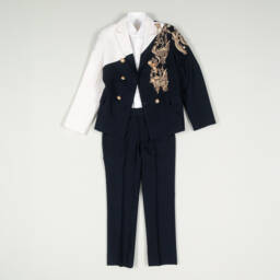 A classic black suit for boys by luxury couture brand Maison Ava, made in a soft wool blend. The blazer jacket is finished in a tonal, floral jacquard, accentuated with hand-embroidered roses and crowned cherubs. Lined for optimal comfort, it has pockets on the front and fastens with a single button closure. For versatile wear, the suit set includes a pair of matching shorts and trousers, with button and zip fastenings and adjustable waistbands to secure the perfect fit. The pale pink, cotton, tailored shirt completes the sophisticated, modern look.