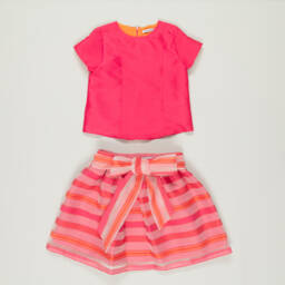Beautiful ivory special occasion skirt set for girls by American brand Mama Luma, handmade in sumptuous, mid-weight satin. The satin twill top is embellished with pink rose appliqués around the back of the shoulder straps, whilst the full, gathered skirt is patterned with a band of pink and green roses and has a stiffened tulle underlay for extra volume. Both pieces are fully lined for comfort and fasten with a neat, concealed zip.