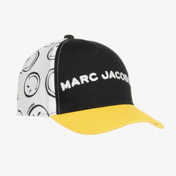 Black logo cap crafted for boys by MARC JACOBS, featuring a stylish rubberised logo on the front. Made from soft cotton twill, it provides comfort and breathability for everyday wear. The stiff peak ensures eye protection from the sun, while the adjustable velcro strap allows for a personalised fit. Ideal for spring and summer outings, limited quantities available, so don't miss your chance to secure this fashionable accessory.