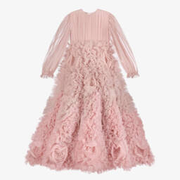 The girls pink tulle bow dress by Marchesa Kids Couture is a fabulous special occasion piece. Made from layers of lightweight tulle, it features a bright pink fixed bow sash around the waist for a striking look. The bodice has a sheer neckline, short sleeves, and pleated detailing, with a concealed zip and crystal keyhole button on the back. Lined in silky cupro with a stiffened organza underlayer, it offers a dramatic and voluminous silhouette. Limited quantities available.
