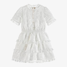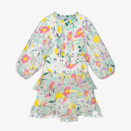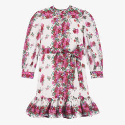 A beautiful beige and pink floral maxi dress for girls by Marlo Kids is a perfect addition to any wardrobe. Crafted from soft cotton sateen, this dress is adorned with vibrant floral patterns. Scalloped red trims and embroidered cutwork add a touch of elegance between the tiered skirt layers. Designed with a tie fastening at the neck, an open back, and elasticated waist for comfort, it also features a zip closure. Limited quantities available, ideal for special spring and summer occasions.