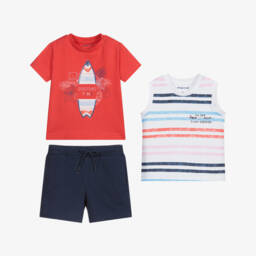 Younger boys three-piece outfit by Mayoral, made in soft cotton jersey. The white vest top has blue, orange and beige stripes with a surf board print, and the navy blue T-shirt has a tropical surf board print. The orange shorts have a navy blue ribbed waistband and adjustable drawstring tie.