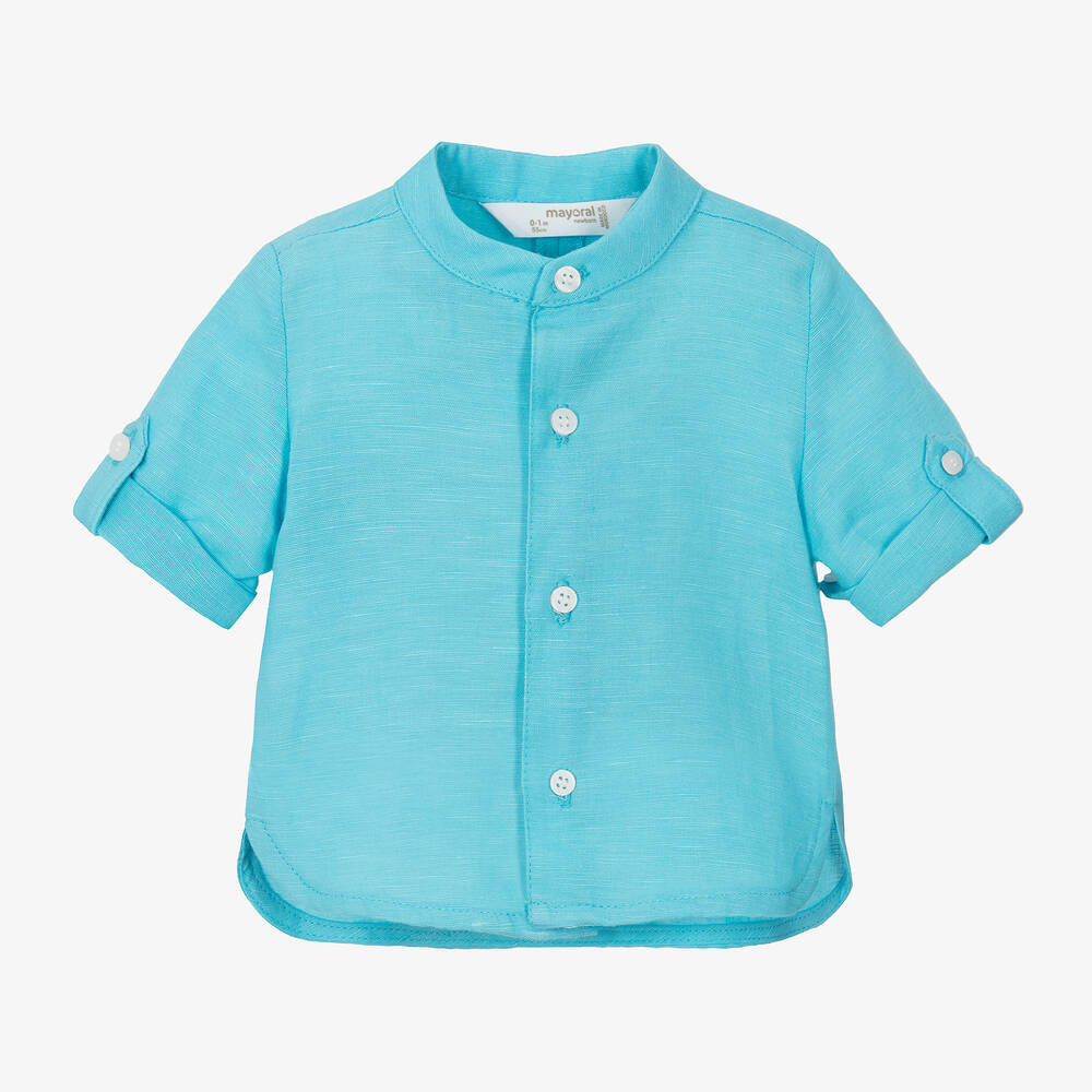 The boys blue linen cotton shirt by Mayoral is a bright blue button-up shirt made from a delicate linen and cotton blend. Featuring a collarless design, neat rounded hem, and long sleeves that can be buttoned up for a relaxed look, this shirt offers both style and comfort. Perfect for spring and summer, it is lightweight and soft, making it ideal for everyday wear. Limited quantities available, so it's the last chance to buy.