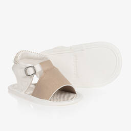 Navy blue faux leather pre-walker sandals for baby boys from Mayoral. They have a strap around the ankle for a secure, supportive fit and the insole is lightly cushioned for comfort. There is a faux silver buckle on the velcro-fastening strap for a stylish finish.