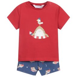Baby boys Mayoral swim shorts set. The green cotton jersey T-shirt has a car on the chest and is great for keeping little shoulders covered in the sun. The silky swim shorts are stretchy and have stars over the blue and white stripes.