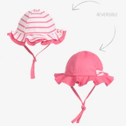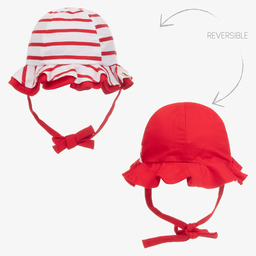 Cute navy blue and white reversible summer hat for baby girls, by Mayoral Newborn. Made in soft, lightweight twill, the striped side has a lovely ruffle trim, a strawberry logo tab on the side, and a red tie-up fastening underneath the chin. The plain red side, has a bow motif on the side.