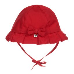 Blue chambray hat for baby girls by Mayoral. Made in soft cotton, it has a scalloped brim with pretty cut-out detail and a bow. It secures with ties under the chin.