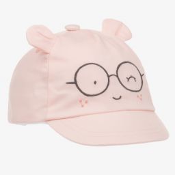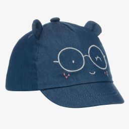 Cute white cap for baby girls, by Mayoral Newborn. Made in soft, lightweight cotton chambray, it has a sweet smiling face embroidered on the front with glasses, and cute 3D bear ears on the top. Lined with white cotton, it has a velcro strap fastening on the back for a secure fit.