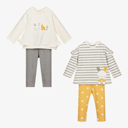 Two cute inter-changeable leggings sets for baby girls by Mayoral Newborn, made in comfortable cotton jersey. The pink set has a white and grey bear appliqué on the top, with printed bears on the leggings. The ivory and grey set has a towelling bear-shaped 'Oh!' on the front and grey ribbed leggings.