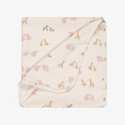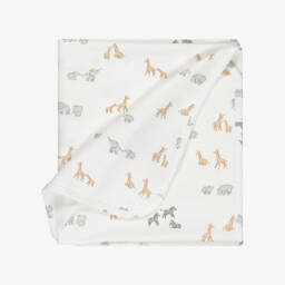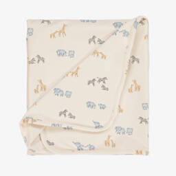 Beige blanket for baby boys and girls by Mayoral, with a delightful print of safari animals in blue and brown. Made in soft cotton jersey, it is lightly padded for warmth and comfort.