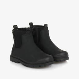 Black Chelsea boots for boys by Mayoral, made in durable faux leather with reinforced rubber toes. This classic style has elasticated side panels that allow easy movement and a side zip fastening for easy pull on. They have a soft fabric lining and a cushioned insole for comfort, with a non-slip rubber sole for good grip.