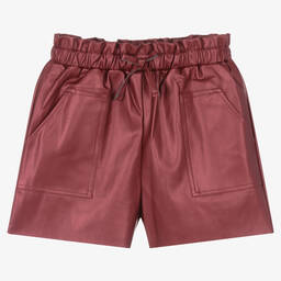 Black soft faux leather shorts for girls from Mayoral. They have a frilled, elasticated waistband with a decorative bow, large patch pockets on the front and raw edge hems. Easy to wear, they simply pull on.
