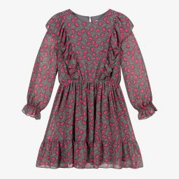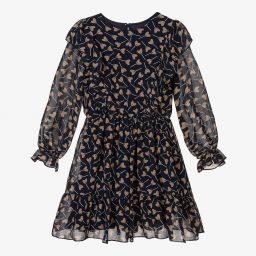 Navy blue and beige dress for girls by Mayoral, made in lightweight chiffon, with a beige, heart-shaped lollipop print. It has a lightweight lining and elasticated waist. There are ruffle trims over the shoulders and a single button fastening on the back.