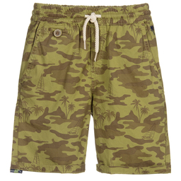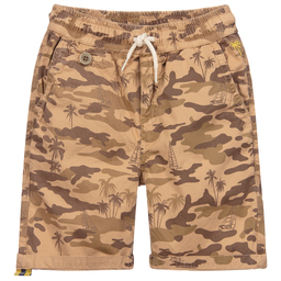 Dark beige shorts for boys by Mayoral, made in soft, lightweight cotton, with a beige and brown camouflage, boat and palm tree print. They have front pockets, with button fastening pockets on the back and an elasticated drawstring waistband.