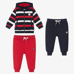 In blue and beige, this three-piece tracksuit for little boys is by Mayoral. Made in a soft cotton blend, the set comprises two pairs of joggers, one navy blue and one royal blue, and a striped hooded zip-up top. Both joggers have an elasticated drawstring waist and the zip-up top has front pockets and a cute little wolf motif on the chest.