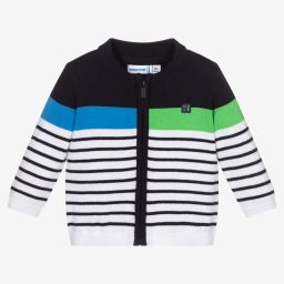 Little boys blue, white and red striped cotton cardigan by Mayoral. Knitted in soft and stretchy organic cotton, it has a zip fastening on the front.