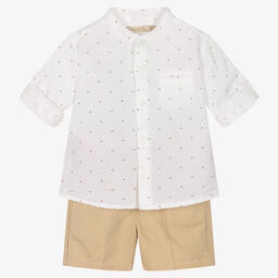 Boys blue cotton linen shorts set by Mayoral is a smart-casual ensemble perfect for spring and summer. The white collarless shirt features a charming blue sunrise pattern and button fastenings, with roll-up tabs for versatile styling. The navy blue twill chino shorts have an adjustable waist and button fastening for comfort. Limited quantities available, last chance to buy this stylish set.
