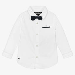 Smart blue sustainable cotton shirt for little boys by Spanish brand Mayoral, with a slight texture within the weave. It has an embroidered navy blue logo by the hemline and a navy blue trim on the faux chest pocket. Fastening with buttons on the front and cuffs, it comes with an adjustable navy blue bow tie.