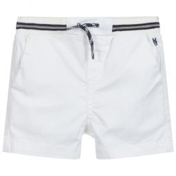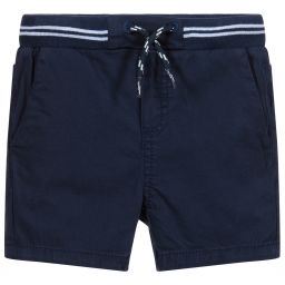 Younger boys blue cotton shorts by Mayoral, made in lightweight twill. The comfortable, ribbed waistband has navy blue and white stripes and a drawstring tie. The shorts have front and back pockets and an embroidered navy blue logo on the front.