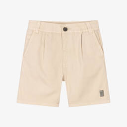 Boys blue cotton shorts by Spanish brand Mayoral offer a blend of comfort and style, perfect for the warmer seasons. Made from slightly stretchy, textured sustainable cotton, they feature an elasticated waist with a faux bone button fastening and matching buttons on the back pockets. Practical jetted pockets and a faux leather palm tree badge on one leg add to their charm. Last chance to buy these versatile Bermuda length shorts, perfect for junior boys.