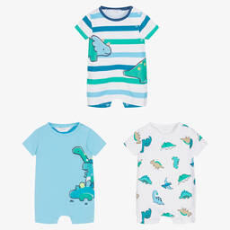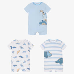 Pack of three light blue and white shorties for baby boys from Spanish designer Mayoral. They are made in soft and stretchy sustainable cotton jersey, with adorable happy dinosaur motifs and striped designs. These short-sleeved babysuits fasten with poppers on the front or side and between the legs for a super quick and easy dressing routine.