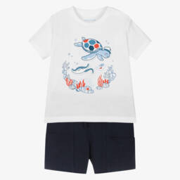 Boys turtle tee and shorts set by Mayoral offers a charming look for junior boys this spring and summer. Featuring a bright yellow tee adorned with a playful turtle and ocean print, paired with comfortable blue shorts with practical pockets. The elasticated waistband ensures ease of wear, making it perfect for outdoor adventures. With limited quantities available, this set is a delightful addition to any wardrobe.