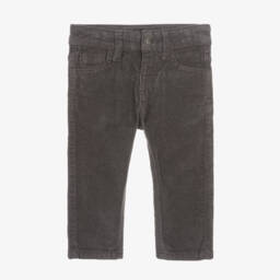 Boys dark charcoal grey slim fit trousers for boys by Mayoral, made in soft, fine corduroy with a slight stretch for comfort. In a classic five-pocket style, they have an adjustable waist for a good fit. Branded rivets and a logo jacron give a stylish finish. Made with sustainable cotton.