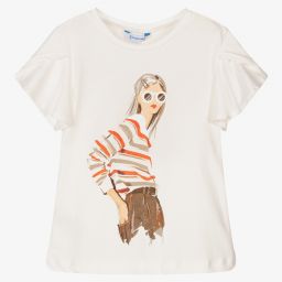 Boys ivory cotton monkey T-shirt by Mayoral features a playful backpack and monkey appliqué in yellow, brown, and blue. Made from soft, comfortable jersey, this oversized T-shirt includes practical popper fastenings on one shoulder for easy dressing. Ideal for young adventurers, it is perfect for casual outings and playtime. Limited quantities available, last chance to buy.
