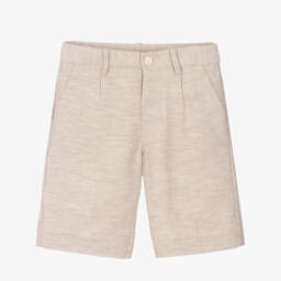 Ivory linen-blend shorts for boys by Mayoral feature a classic stripe design. Crafted from a soft cotton and linen mix, these shorts offer comfort and style with slanted front pockets and a buttoned back pocket. The adjustable waistband ensures a snug fit for growing boys. Ideal for sunny days, this is the last chance to buy with limited quantities available, perfect for stylish outings or casual play.