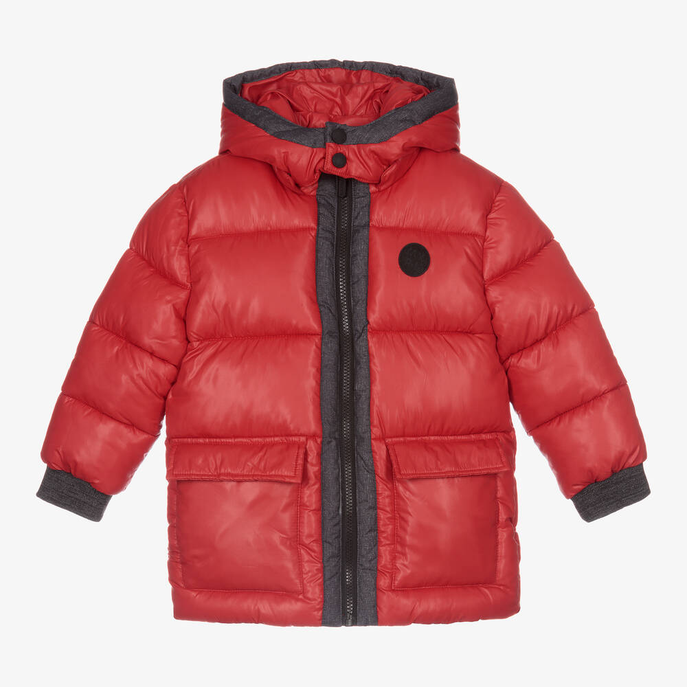 Red puffer coat for boys by Mayoral, made in lightweight polyester with a sheen. Warmly padded, it has a cosy, black fleecy lining and grey ribbed trims to keep the cold out. The hood is detachable and the front flap pockets are secured with poppers. There is a black silicone logo badge on the front.