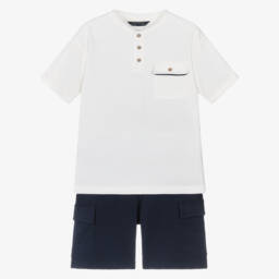 The beige ivory shorts set for boys by Mayoral Nukutavake is perfect for laid-back days. Crafted from soft jersey, the ivory henley top features stylish fixed, turned-up cuffs and a chic beige trim on the chest pocket. The coordinating beige shorts, made from lightweight sweatshirt jersey, offer a comfortable drawstring waist and practical side seam and cargo pockets. Add this versatile outfit to the wardrobe while limited quantities are available, ensuring both comfort and style for spring and summer.