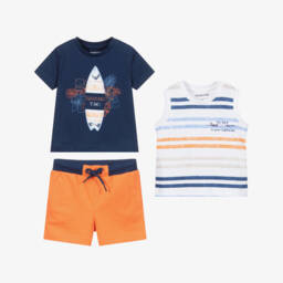 Boys red and navy shorts set by Mayoral is crafted in soft cotton jersey, perfect for active days. The T-shirt showcases a trendy skateboarding graphic and a motivational slogan, while the shorts feature an elasticated waist for a comfortable fit. Seam pockets add practical charm, ideal for storing small essentials. With limited quantities available, this vibrant set is a must-have addition to any young adventurer's wardrobe.