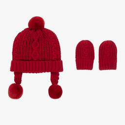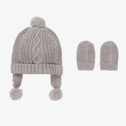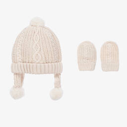 A light brown hat and mittens set for baby boys and girls by Mayoral, knitted in a super soft cotton blend. Warm and snuggly for colder days, this set has a cute cable knit pattern and comfortable ribbed trims. The beanie has faux fur pom-poms on the top and on the ear flaps.