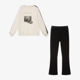 Cute beige and blue leggings set for little girls by Mayoral, lovely on casual days. The soft jersey top has flowers appliquéd and stitched on the front, with a flowy hemline. There are popper fastenings on the back to help with dressing. This outfit is comfortably finished with velour leggings.