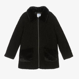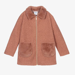 Beige bouclé coat for girls by Mayoral, with a super soft faux fur collar and patch pockets. It has a gold zip fastening on the front with logo pull tabs.