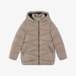 This beige puffer coat for older girls by Mayoral offers both style and warmth. It features a cosy hood and two front pockets adorned with stylish stud details. The coat is padded for extra warmth and has a soft, black fleece lining for added comfort.