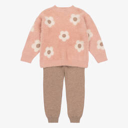 A cosy beige and black trousers set for girls by Mayoral, in a super soft knit. The sweater is fluffy with a cute love heart pattern. For a comfortable finish, the trousers have stretchy ribbed cuffs.