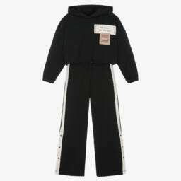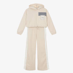 Beige tracksuit for older girls by Mayoral, made in soft, comfortable jersey with a warm, fleecy inside. Ideal for casual wear, the cropped hoodie has a drawstring hem and a bold logo print on the front. The wide-leg trousers have an elasticated waist and contrast ivory trims with popper detailing.