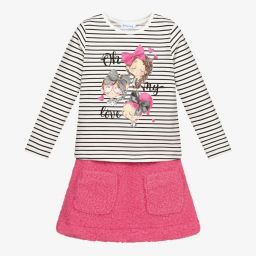 Navy blue skirt by Mayoral, with an ivory and navy blue striped top. The comfortable cotton jersey top has a pink and beige girl print on the front with the words 'Oh my love'. The heavier weight bouclé skirt is fully lined, with pockets on the front and a useful, adjustable waistband.