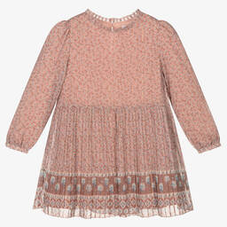 Dusky blue dress for girls by Mayoral, made in soft chiffon with metallic stripes. It has a beautiful blue and ivory floral pattern all over and a chic pleated skirt. Fully lined in soft and lightweight viscose, it fastens with a single button on the back.